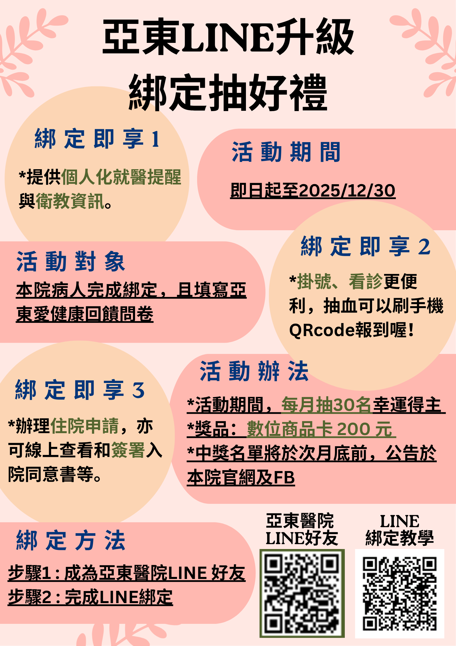 綁定「亞東 愛 健康」LINE專區 享專屬醫療服務抽好禮